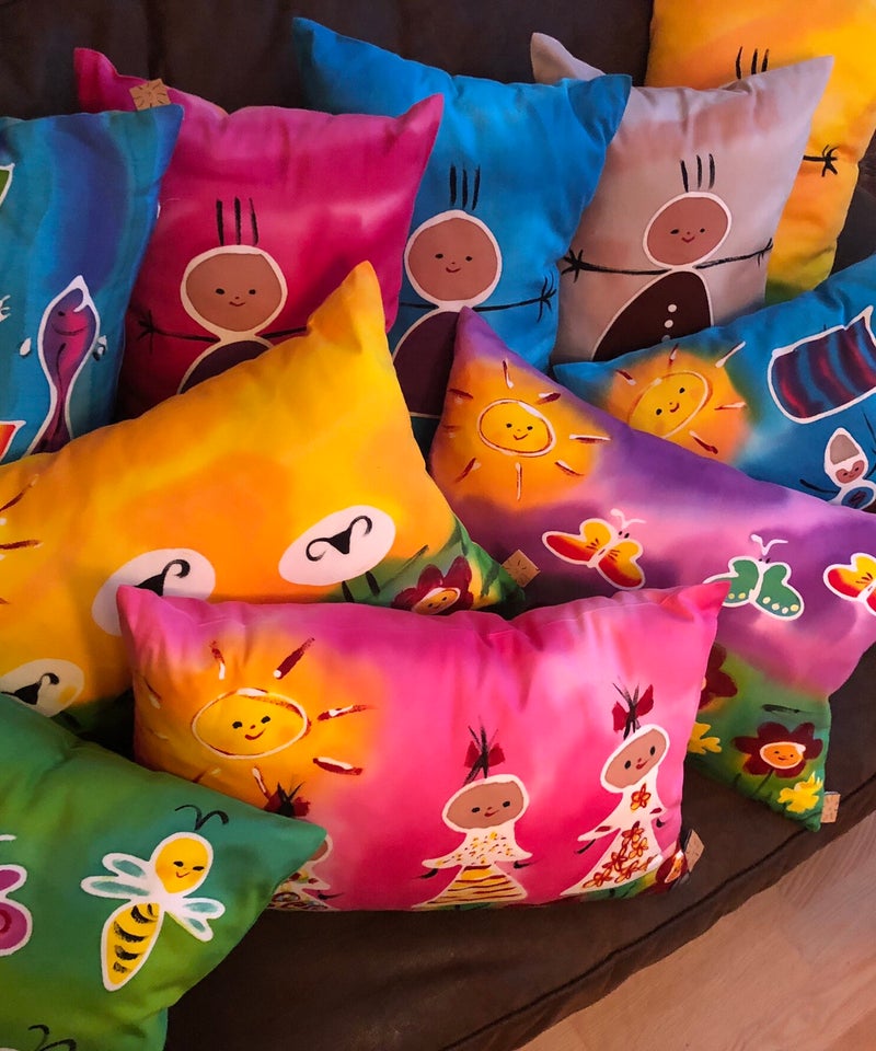Litirnir eru mjög þvottþolnir og mála ég á bómullarpoplín sem heldur sér mjög vel í mörg, mörg ár. Sum verin hafa verið notuð fyrir 2-3 börn og það sést ekki á þeim.